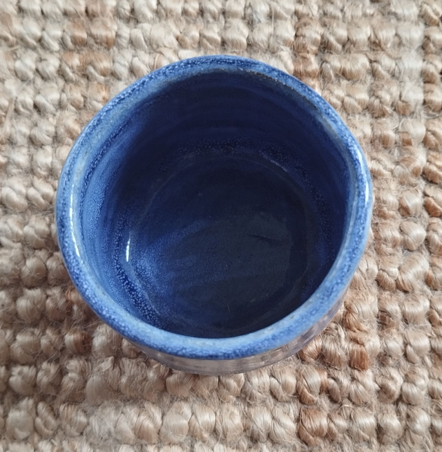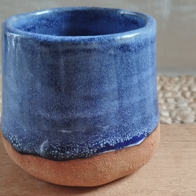 Tasse ronde sans anse, argile rouge, émail bleu et blanc