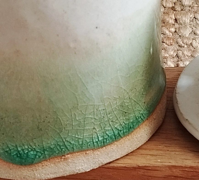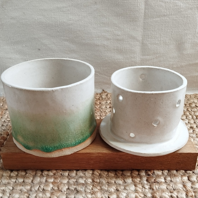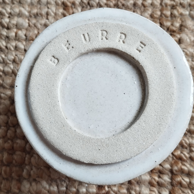 Beurrier à eau, argile blanc, émail blanc et vert craquelé