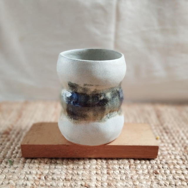 Vase, argile blanc, émail blanc avec taches de rose, bleu et vert