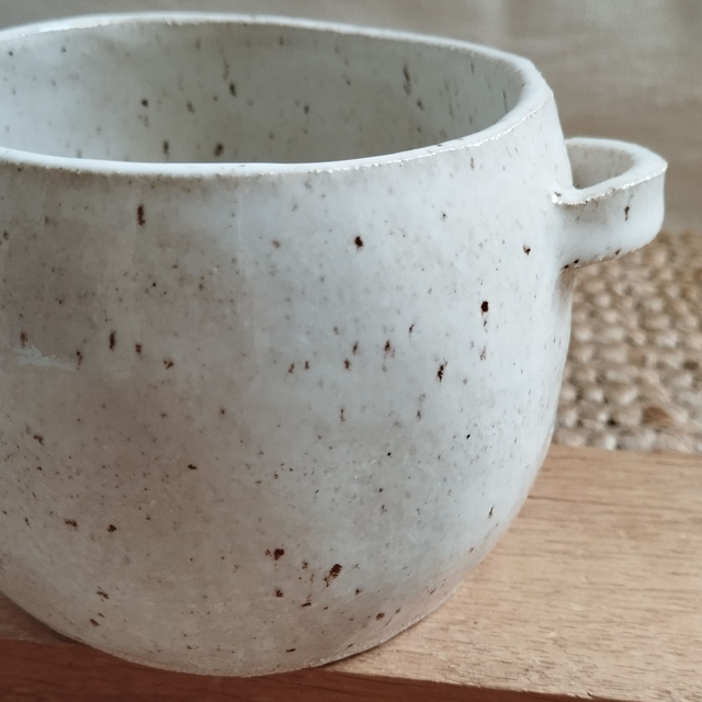 Petit cache-pot "panier", argile blanc, émail blanc pyrité