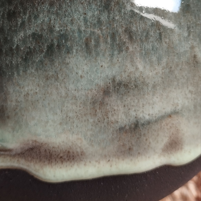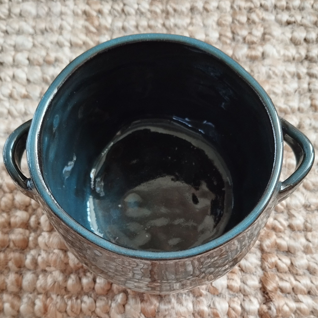 Petit cache-pot "panier", argile noir, émail bleu-vert
