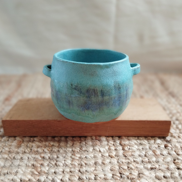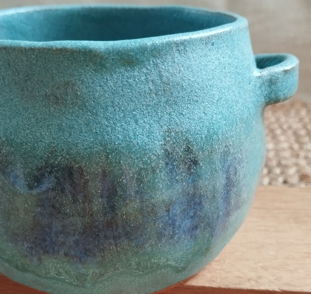Petit cache-pot "panier", argile rouge, émail turquoise avec effets violets