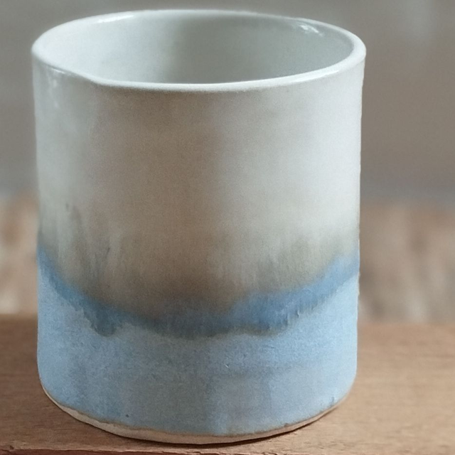 Tasse sans anse, argile blanc, émail blanc et bleu clair