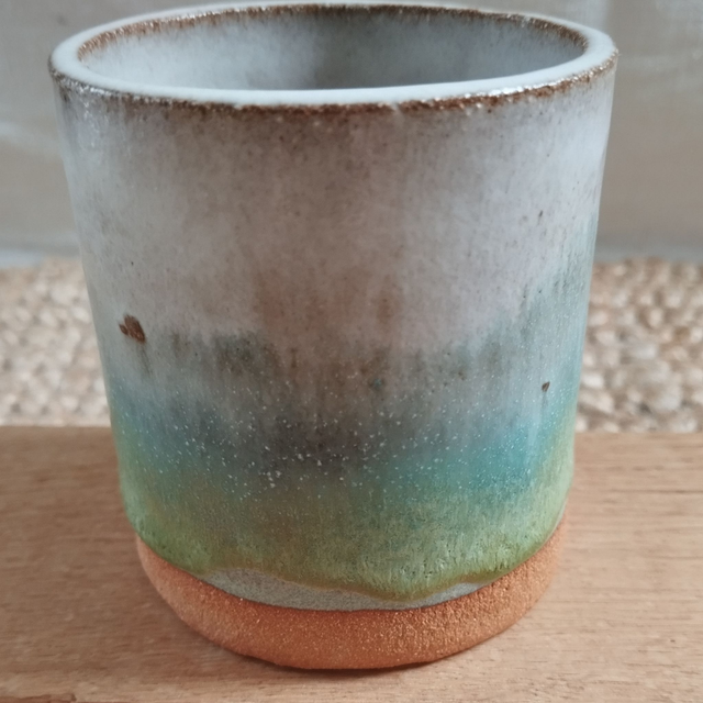 Tasse sans anse, argile rouge, émail blanc, turquoise, vert