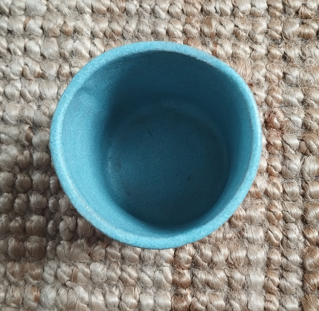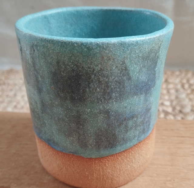 Tasse sans anse, argile rouge, émail turquoise avec effets violets